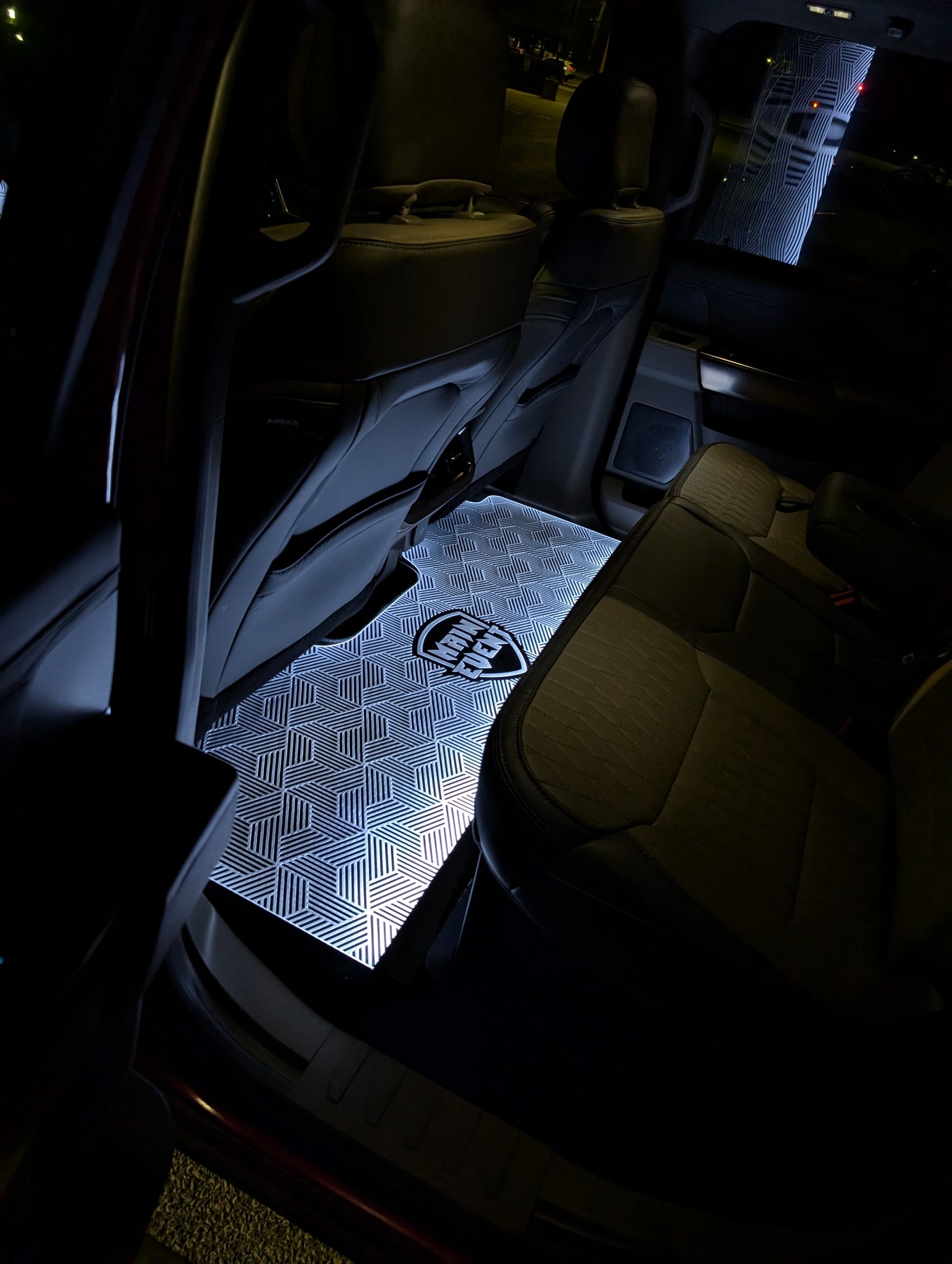 This is a beta release of our first-ever LED rear floor mat. Fits 2017-2025 crew cab Super Duty trucks and 2021+ F150 crew cab trucks (we may require dimensions to verify). This mat is clear and shows the carpet underneath.